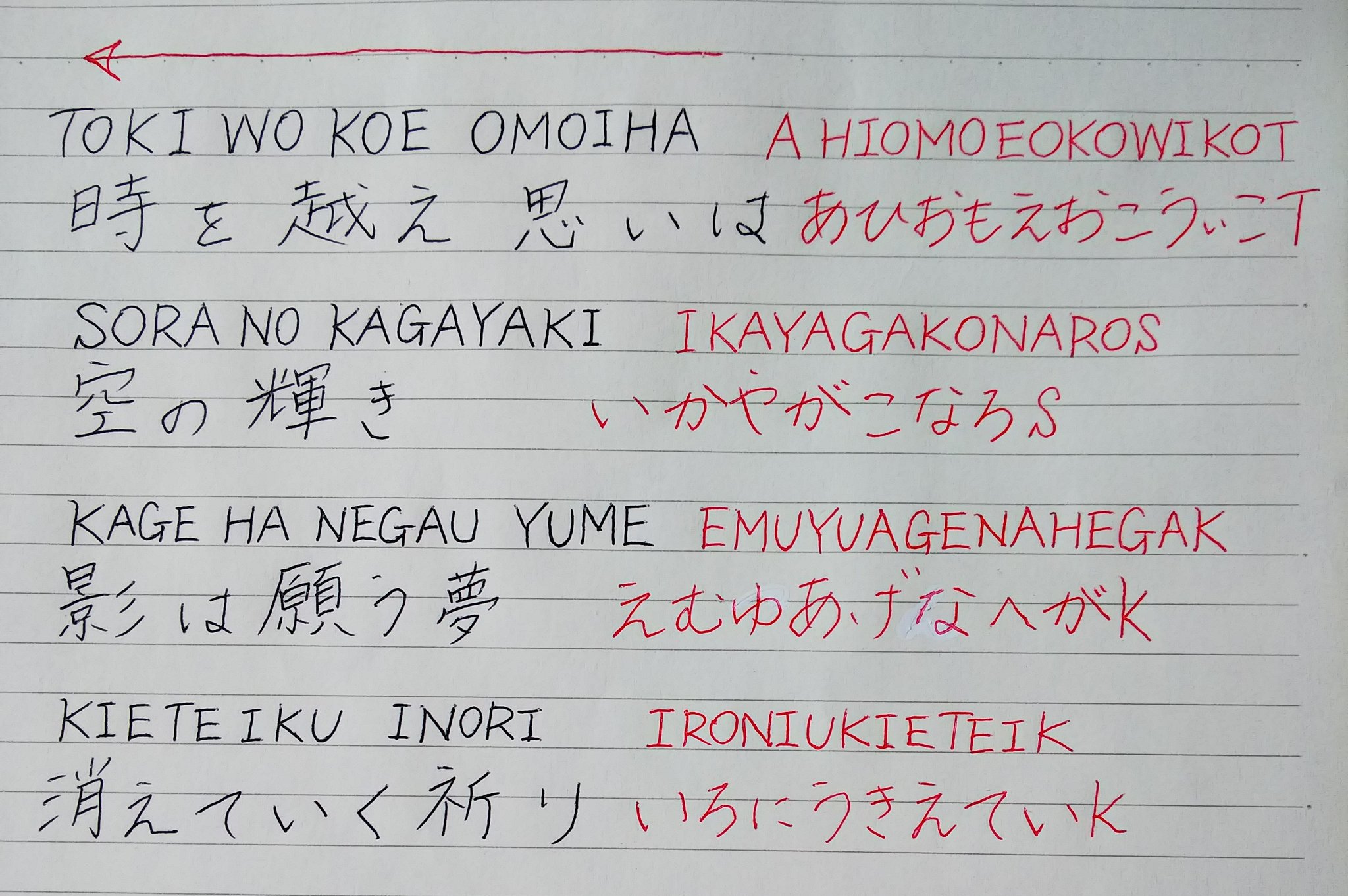 さくぱん Shockのアンサンブルの歌詞 単純に平仮名を逆さから読んでいるんじゃなくて 光ちゃんが 平仮名をローマ字 に分解して音に載せる ってよく言ってたように歌詞を全部一旦ローマ字変えて それを逆さから読んだの